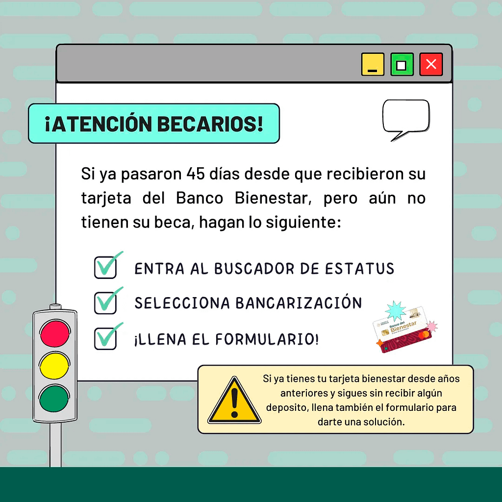 ¡Atención beneficiario! Si han transcurrido 45 días desde que recibiste tu tarjeta del Banco del Bienestar y en el Buscador de Estatus el semáforo está en amarillo, es momento de tomar acción. Llena una sola vez el formulario disponible en el apartado de bancarización.